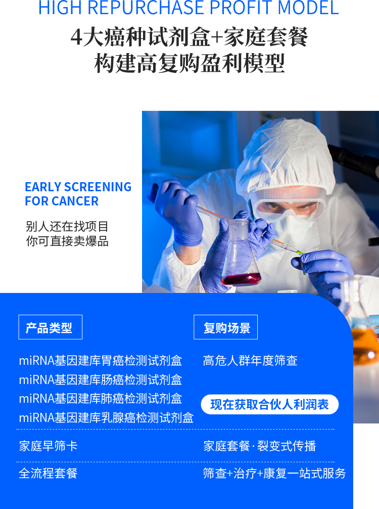 健生公司聘請了多名海外華人教授,引進美籍華人科學家王家旺教授共同研發打造miRNA早期診斷惡性腫瘤產品。利用miRNA分子診斷惡性腫瘤核心技術,研發轉化胃癌診斷、腸癌診斷、肺癌診斷等覆蓋全癌種的早診早篩分子診斷惡性腫瘤產品。